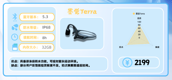 墨觉 Terra 是一款主打防水与稳定性的专业运动耳机,最大的亮点在于 IP68 级防水。实测在泳池中连续游泳 1000 米仍无进水和爆音,水下训练或雨中跑步都能稳定输出。不过,触控操作在手指湿滑时灵敏度略有下降,水下切歌偶有延迟,节奏训练中稍显不便。