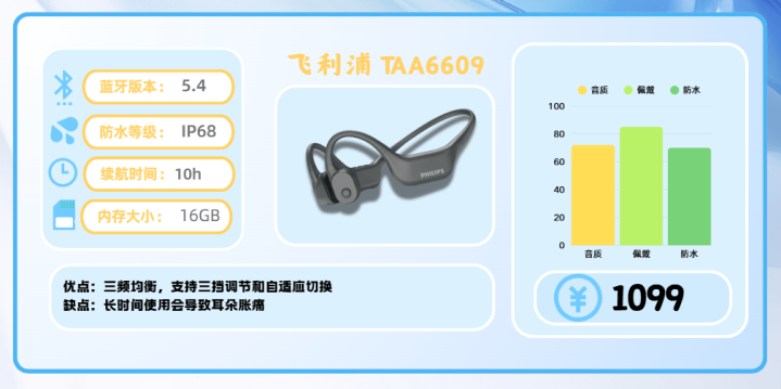 作为老牌声学品牌,飞利浦 TAA6609 在运动耳机领域延续了其一贯的专业水准。凭借舒适的佩戴体验、优质音质表现以及强大的防护性能,它成为跑步、骑行乃至游泳人群的可靠伙伴。无论是陆上挥汗如雨,还是泳池中畅游,它都能稳定输出,陪伴每一次运动。